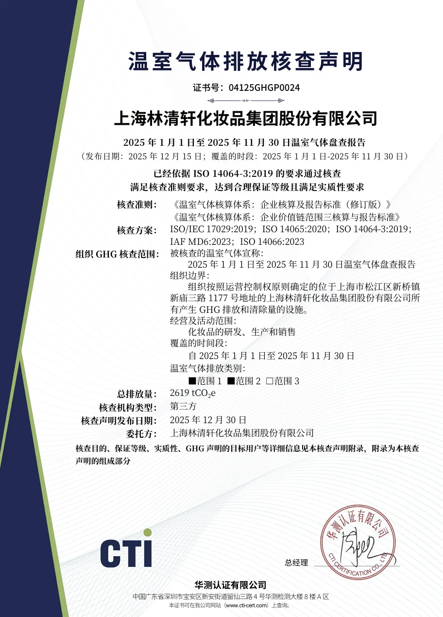 林清轩集团近日在港交所上市,当日同步获得由专业平台华测认证颁发的碳中和证书。其位于上海松江的科研智造基地自投产至2025年11月30日期间,实现运营碳排放全量中和,成为国内化妆品行业首个达成运营碳中和的企业。这一突破标志着中国美妆产业在低碳转型中迈出实质性步伐。