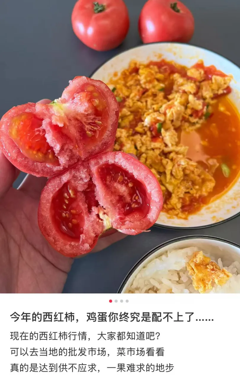 它的“老搭档”鸡蛋均价只有3-6元/斤,一斤西红柿价格,竟然能买两斤鸡蛋。有网友吐槽:“鸡蛋一块钱一个都配不起西红柿了。”