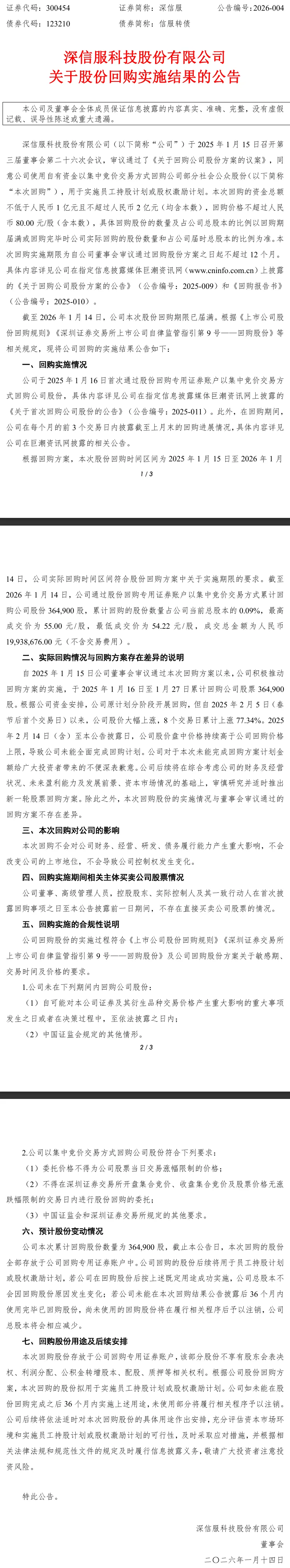 深信服于1月14日发布《关于股份回购实施结果的公告》,公告信息显示:
