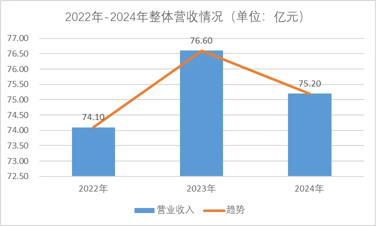 深信服 2022年整体营业收入74.10亿,2023年整体营业收入76.60亿,2024年整体营业收入75.20亿。