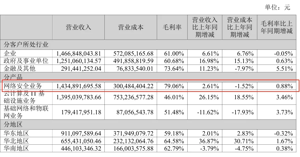 其中,网络安全业务营收14.35亿,比上年同期增长2.61%。