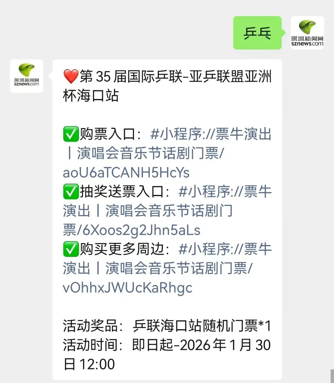 乒联海口站随机门票一张