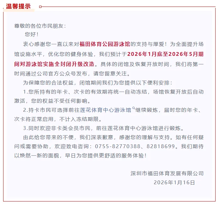 ● 福田:福田体育公园游泳馆预计于2026年1月底至2026年5月期间对游泳馆实施全封闭升级改造。