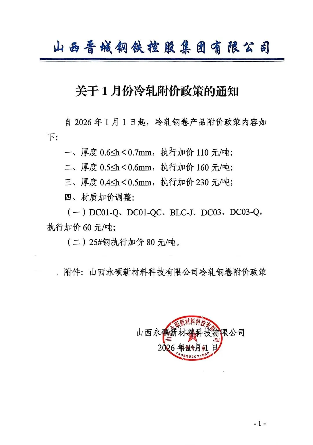 >关于冷轧附价政策调整的通知