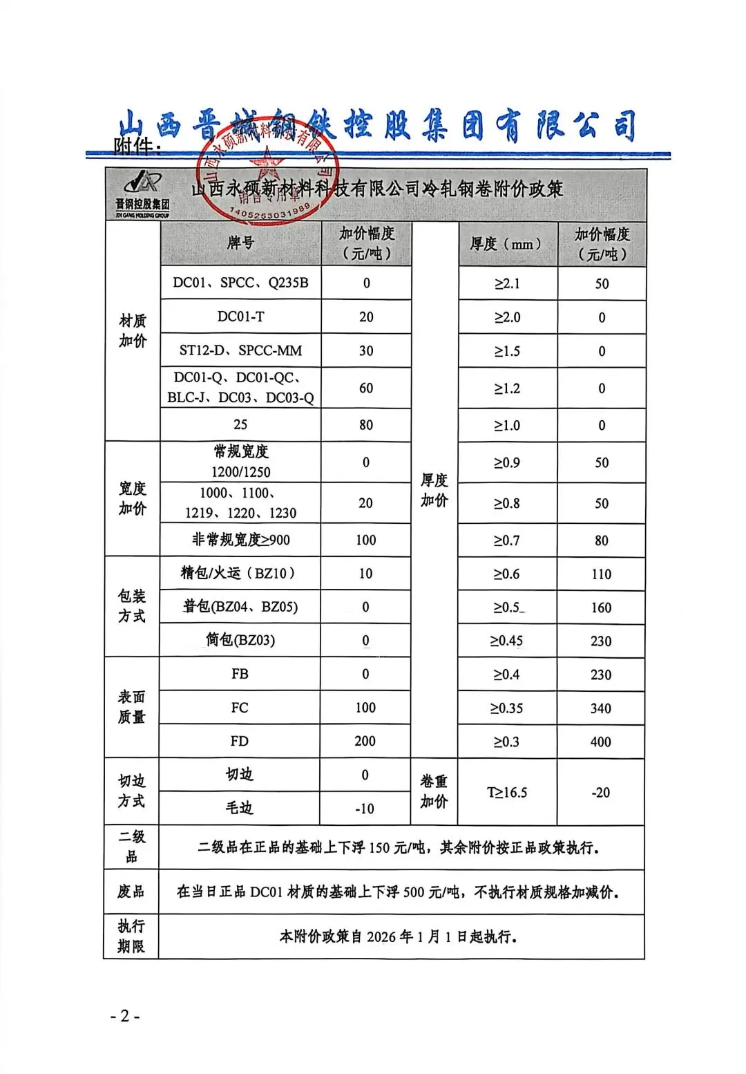 关于冷轧附价政策调整的通知