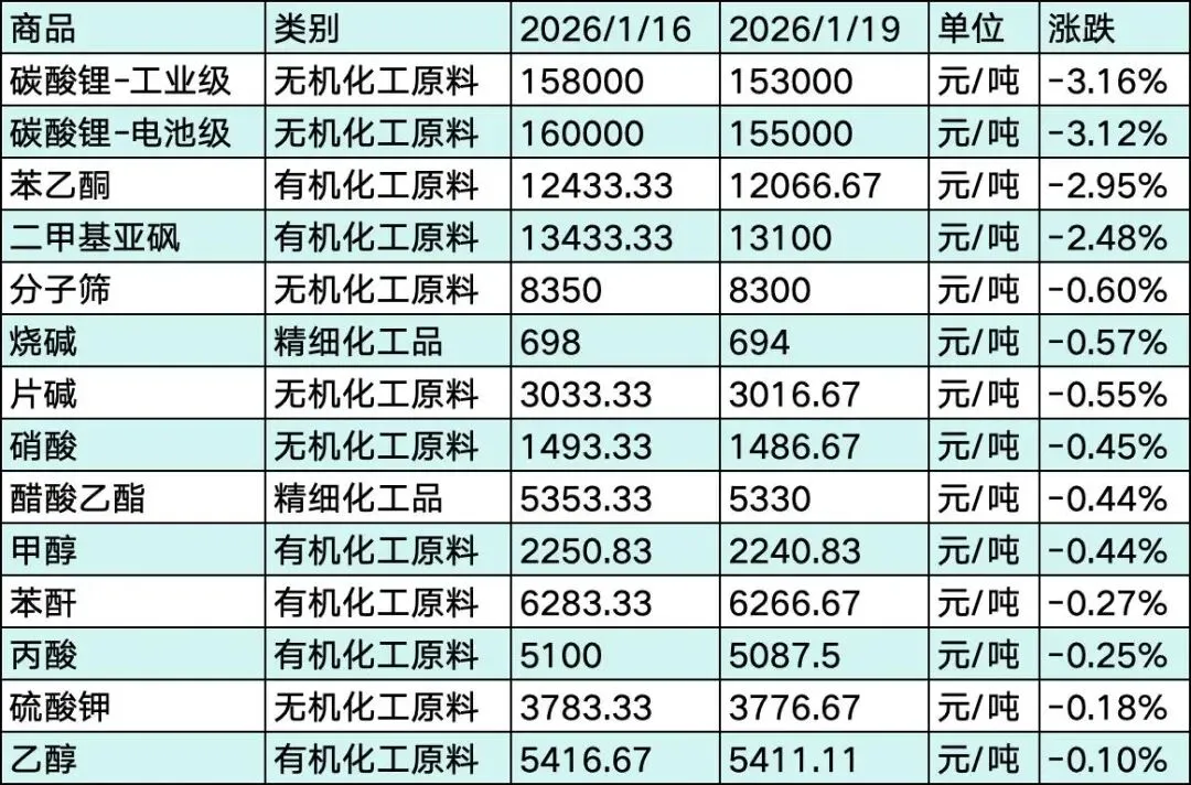 -下跌品种数量增加,碳酸锂成深跌主力:14种产品价格下跌,下跌品种数量较此前显著增加,但多数跌幅较浅。碳酸锂-工业级以-3.16%的跌幅成为本周领跌品种,碳酸锂-电池级(-3.12%)紧随其后,二者形成3%以上深跌梯队;苯乙酮(-2.95%)、二甲基亚砜(-2.48%)构成2%-3%跌幅区间;其余11种下跌品种跌幅均不足1%,呈现“核心品种深跌、普品窄调”特征。下跌压力集中于普通锂盐及部分有机化工品,前者源于去库与产能预期,后者受淡季节奏压制。