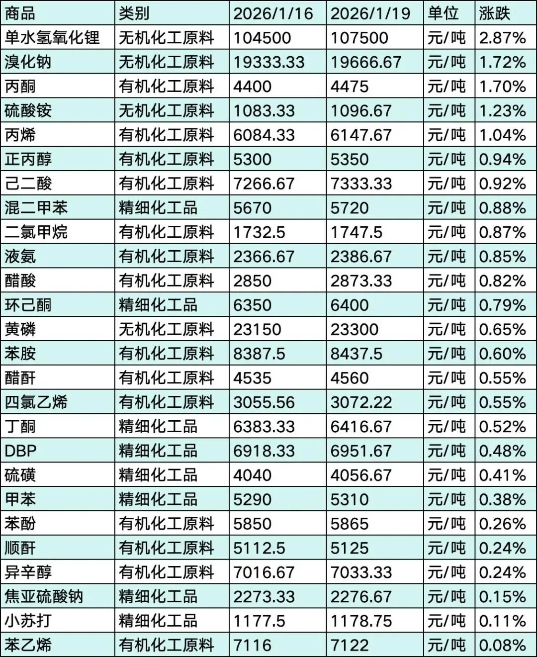 -丙酮(+1.70%)、丙烯(+1.04%):原油成本传导+下游补货,同步上涨。近期国际原油价格延续回升态势,1月16日美原油主连收盘价较前一日上涨1.2%,带动上游石脑油、丙烯等原料价格上涨,成本端支撑增强。需求端,下游涂料、MMA行业节前最后一轮补货启动,采购需求边际改善,推动丙酮、丙烯价格上涨,延续油系产业链回暖态势。