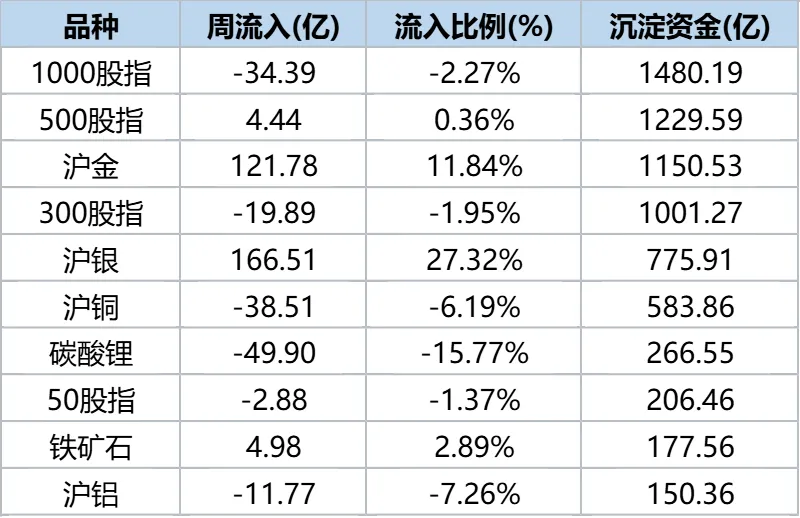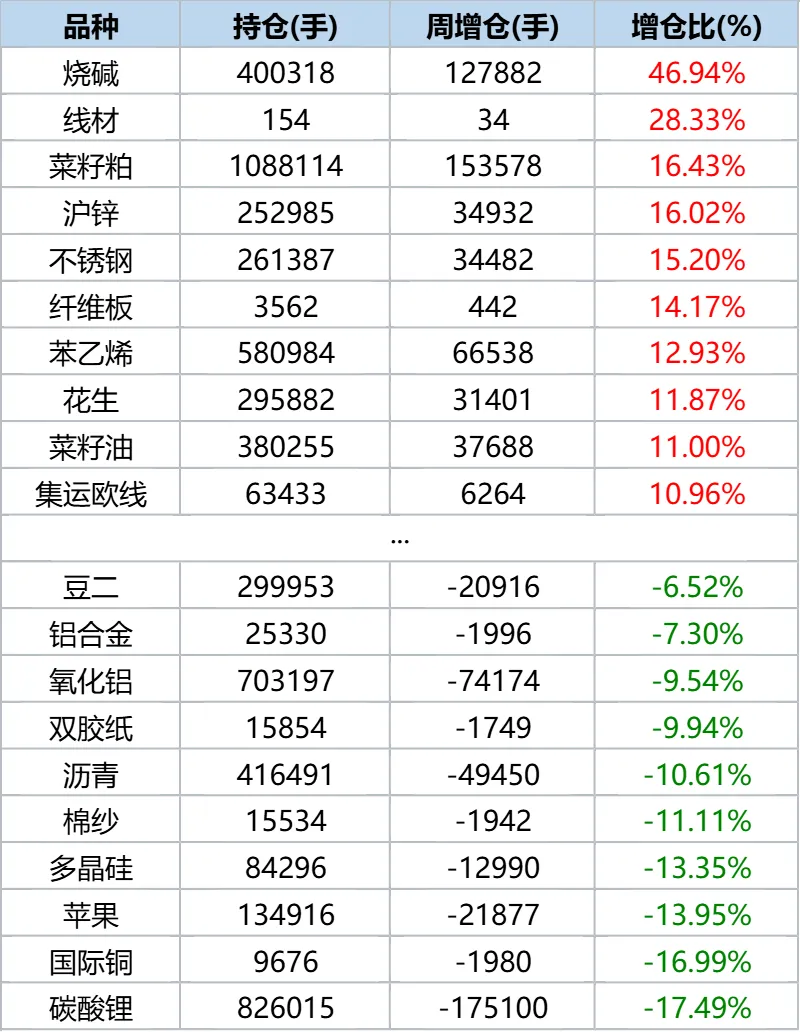 每周统计,包括沉淀资金、涨幅、增仓比、期现比、价格水位五个排名表,根据周五的最新数据做统计;每周一发布,遇节假日顺延。