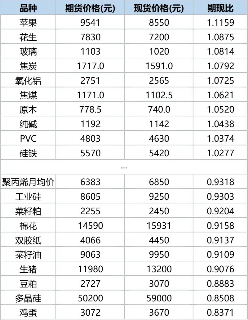 说明:期现比=期货主力合约价格/现货价格,大于1为期货升水,小于1为期货贴水。