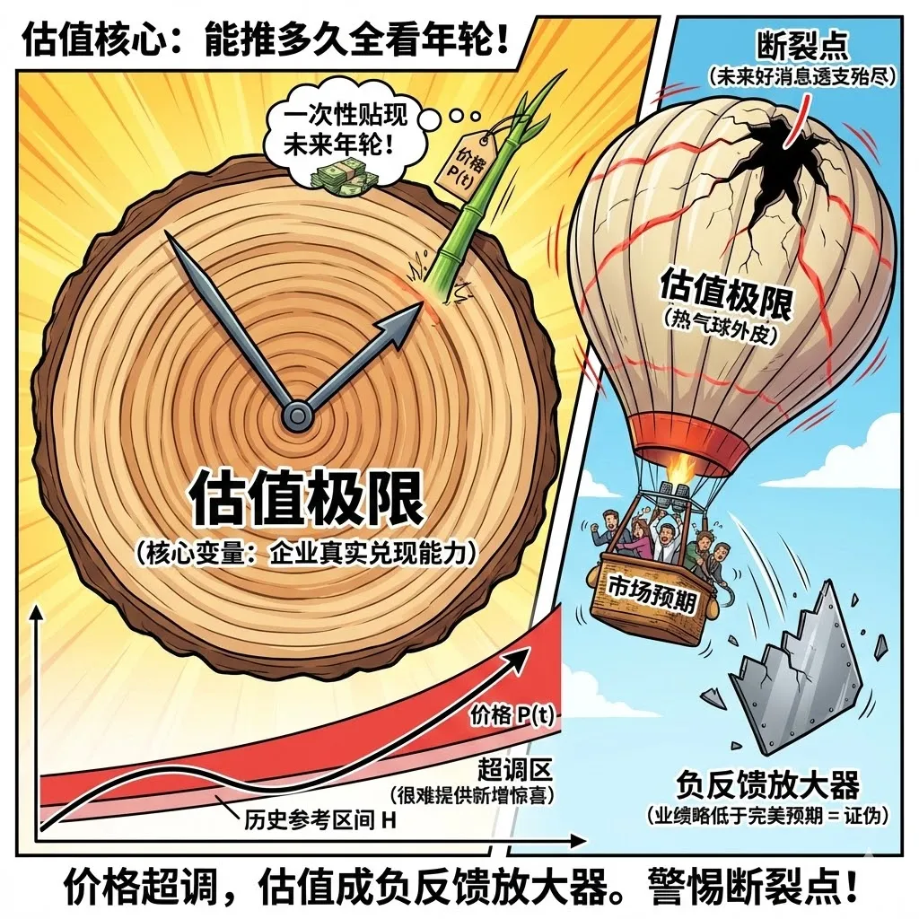 此时,估值从“正反馈助推器”,转变为“负反馈放大器”:任何略低于完美预期的财报、指引或进度,都会被解读为“证伪”,从而引发价格向价值回归的加速度。
