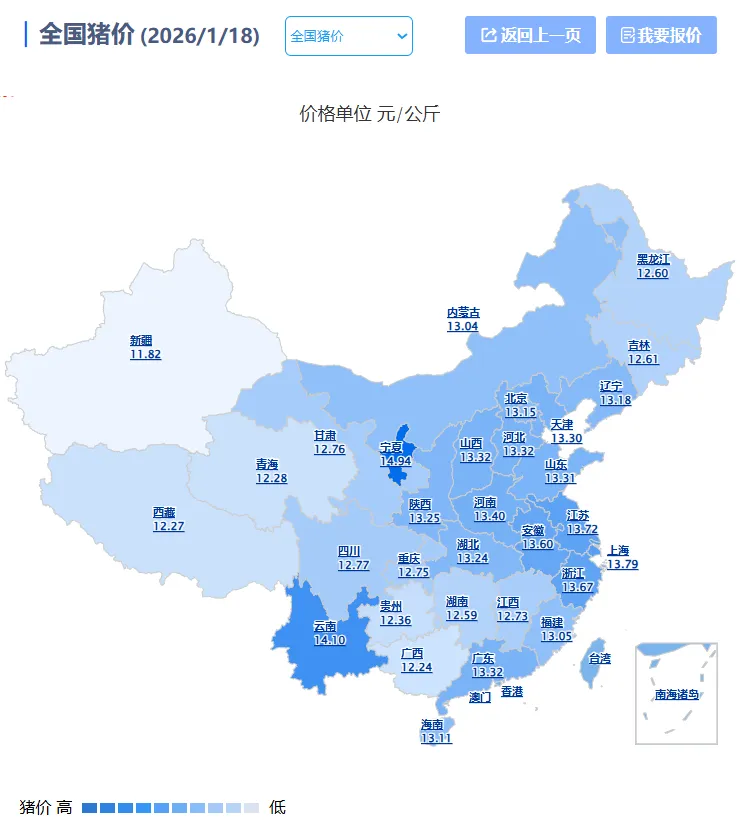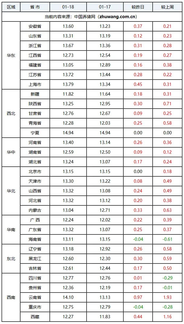 生猪(品种:外三元)均价为13.02元/公斤,猪价较昨日上涨了0.21元/公斤;