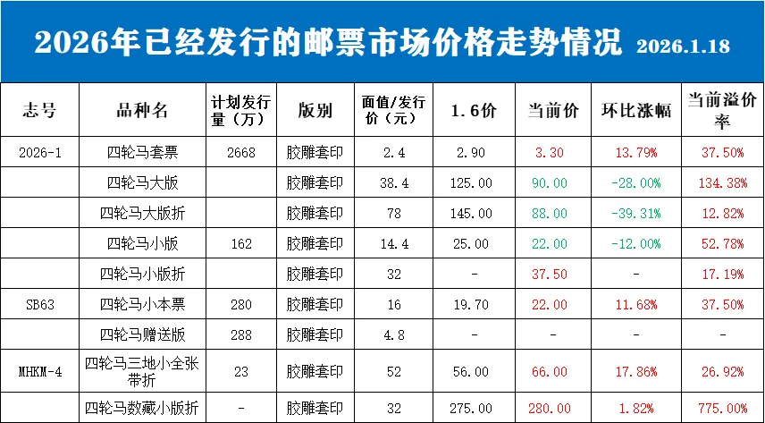 2026年邮票最新行情(2026.1.18):四轮马套票马小本稳中有升,马大版如流星划过夜空留下短暂的璀璨