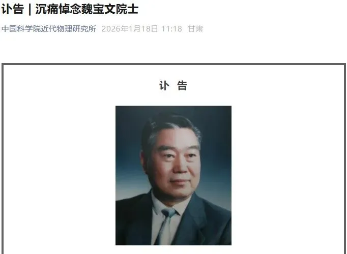 【中国著名核物理学家魏宝文逝世,享年91岁】1月18日消息,据中国科学院近代物理研究所消息,中国共产党党员、中国科学院院士,中国著名核物理学家、加速器物理学家,第八届全国人大代表,第八届、第九届甘肃省人大常委,中国第一台重离子加速器大科学装置工程总工程师,兰州重离子加速器国家实验室原主任、中国科学院兰州分院原院长、中国科学院近代物理研究所原所长魏宝文同志,因病医治无效于2026年1月17日19时25分,在兰州逝世,享年91岁。(央视新闻)