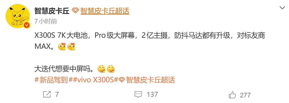 【消息称vivo X300s系列手机搭载7K大电池、2亿主摄,对标友商Max机型】据博主@智慧皮卡丘 爆料,vivo X300s或搭载7K大电池、2亿像素主摄,防抖等方面也有升级,对标友商Max机型。(IT之家)