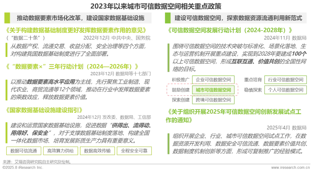 自2019年首次提出培育数据要素市场以来,中国围绕数据要素市场化配置出台了一系列顶层设计与战略规划,促进数据的合规高效流通使用。可信数据空间作为关键的数据基础设施,在破解数据流通难题、激活数据要素价值方面具有重要的作用。《可信数据空间发展行动计划(2024-2028年)》提出鼓励创建城市可信数据空间,支持有条件的地区发挥公共数据资源的引领作用,构建城市数据资源体系,支撑城市建设、运营、治理体制改革。目前,首批13个城市可信数据空间试点名单已经公布,城市可信数据空间建设将迈向规模化落地。