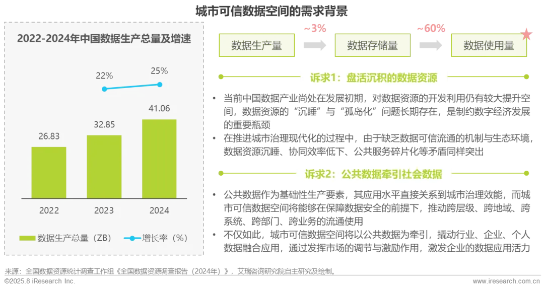 2024年,中国数据生产总量超过40ZB,但数据存储量仅约生产总量的3%,存储数据中未被使用的数据占比约四成,数据要素的价值有待进一步释放。城市作为数字中国建设的综合载体,在推进城市数字化转型、智慧化发展的过程中,同样面临着数据资源开发利用不足的问题,而可信数据空间恰恰是盘活数据资源的关键。城市可信数据空间通过整合分散的公共数据资源,提供安全合规的流通使用环境,推动公共数据实现供得出、流得动、用得好,将有助于提升城市治理的效能。不仅如此,由政府主导的城市级别的可信数据空间将以公共数据为牵引,进一步促进行业、企业、个人等维度的数据融合应用,为数字经济的创新发展赋能。