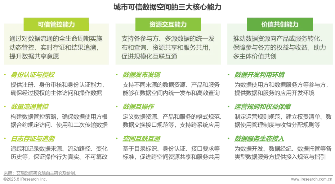 城市可信数据空间的核心能力由可信管控、资源交互与价值共创三部分组成。其中,可信管控能力重点保障数据流转过程的实时管控与全程追溯;资源交互能力提供统一的数据发布发现机制与互操作规范,助力跨系统、跨空间的数据互联互通;价值共创能力是通过构建安全的开发环境、明晰的运营规则与收益分配机制,吸引多方入驻,最终形成数据服务的新生态,激发数据要素价值。
