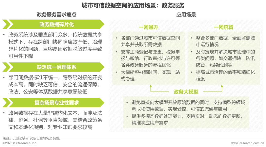 政府各部门数据标准不一、“部门墙”问题突出,加之缺乏统一的治理体系,政务数据的应用长期存在碎片化、分散性的痛点。为破解这些难题,城市可信数据空间通过构建可信、安全的运行环境,明确数据共享与流通中的权责规则,为跨部门的数据互联互通提供了有效保障。作为城市级别的数据基础设施,城市可信数据空间将促进“一网通办”与“一网统管”等应用的高效落地,同时为政务大模型的训练与应用提供高质量、合规的数据基础,推动政府决策与公共服务的智能化水平提升。