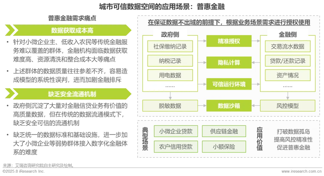 在城市可信数据空间中设立金融数据专区,融合政府公共数据与银行、消费金融公司等机构的金融数据,能够实现在不共享原始数据的前提下,支撑金融机构安全调用多方数据接口。通过汇聚政府侧人社、住建、纳税等公共信息,与金融侧的供应链交易流水、用户资产、消费行为、企业信用等多元化数据,可以构建动态风险评估模型,实现对企业和个人信用状况进行更加精准地判断,从而推动普惠金融的发展,避免弱势群体被排除在金融服务体系之外。