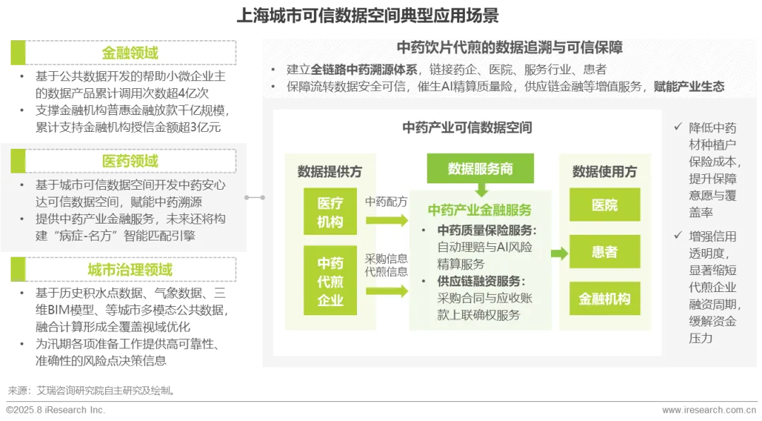 目前,部分领先企业已经基于上海城市可信数据空间开展深度应用探索,在金融、医药及城市治理等诸多领域形成数据产品和服务。如在金融领域,基于公共数据开发数据产品,包括“用电波动指数”“物流履约率”“资质评级”等,支撑金融机构普惠金融放款与场景金融授信;在医药领域,开发中药安心达可信数据空间,实现中药溯源、构建产业金融服务及“病症-名方”智能匹配引擎;在城市治理领域,通过融合计算多模态公共数据形成全覆盖视域优化,赋能防汛指挥与社会化出行平台等。