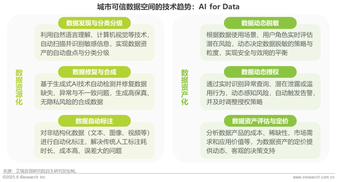 在城市可信数据空间的构建中,AI技术正在成为驱动数据治理效能提升的关键。AI for Data的核心价值在于,将传统数据治理过程中高度依赖人工、规则驱动的治理方式转变为更加自动化、智能化、动态化的治理策略。 如在数据资源化阶段,自动进行数据分类分级和数据标注,在数据资产化阶段进行动态脱敏与授权等,通过保障数据空间内流通的数据优质、安全、可靠,为后续的数据价值挖掘与应用奠定坚实的基础。