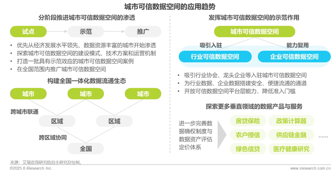 当前城市可信数据空间尚处在试点先行的阶段,未来将遵循“试点-示范-推广”的路径,实现全国范围内的推广。同时,以长三角为代表的区域已率先开展区域内数据安全可信流通的合作建设,随着未来城市可信数据空间在技术、标准与市场等各方面逐步成熟,将有望建成从城市节点到区域枢纽再到全国网络的一体化生态格局。