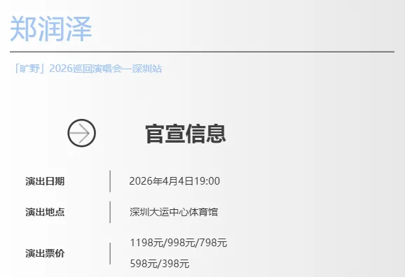 ● 龙岗:郑润泽「旷野」2026巡回演唱会—深圳站定档大运中心体育馆。