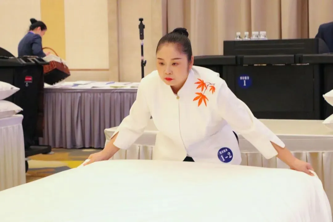 过往多次参赛经历,让我深知“差之毫厘,谬以千里”,日常练习中,我反复拆解操作流程,攻克铺单平整度、套被速度与美观度等难点,在重复中找技巧,在细节里抠品质,慢慢将规范动作内化为肌肉记忆,让每一步操作既符合标准,又兼顾效率与质感。