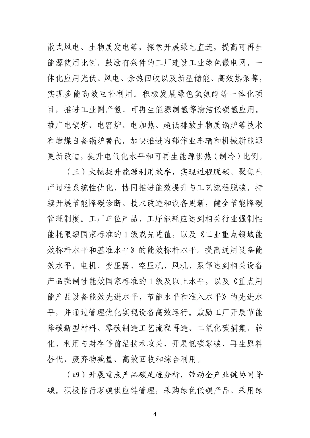 四是工作要求。包括强化组织实施、完善零碳工厂建设标准体系、推广节能降碳综合服务三个方面。