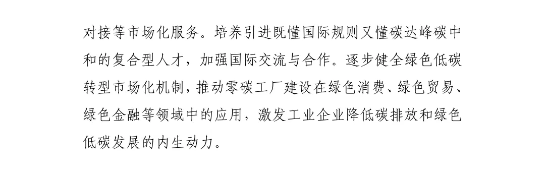 三是推广节能降碳综合服务。鼓励相关行业协会、研究院所、服务机构等发挥自身优势,开展科技成果转化、技术推广、供需对接、标准研制、教育培训、国际合作等公共服务。培养引进既懂国际规则又懂碳达峰碳中和的复合型人才,加强国际交流与合作。逐步健全绿色低碳转型市场化机制,推动零碳工厂建设在绿色消费、绿色贸易、绿色金融等领域中的应用。