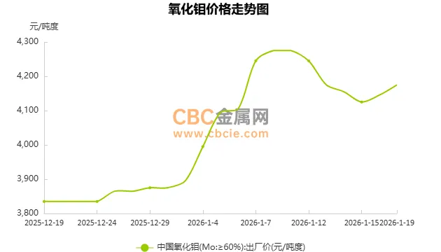 今日中国氧化钼(Mo≥60%)出厂含税报价上涨,目前在4140~4210元/吨度,均价4175元/吨度,较昨日上涨30元/吨度。