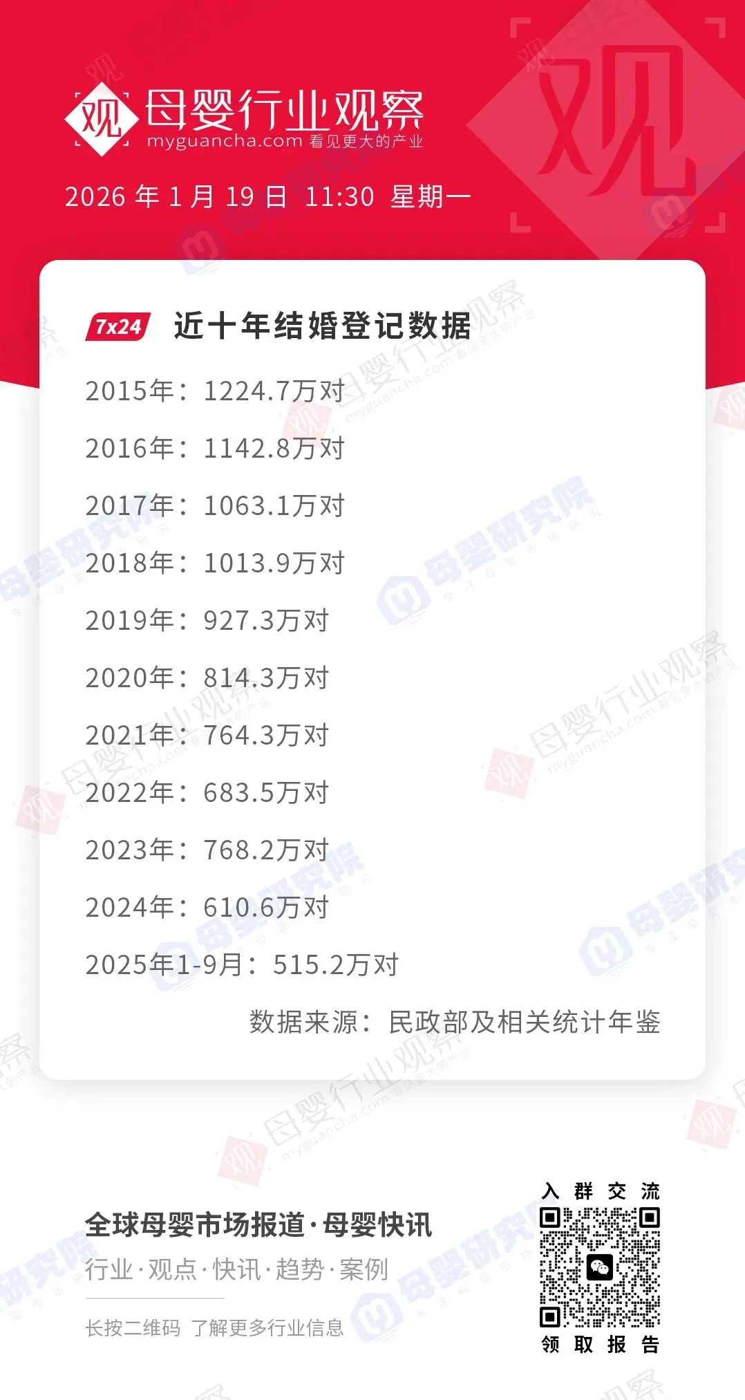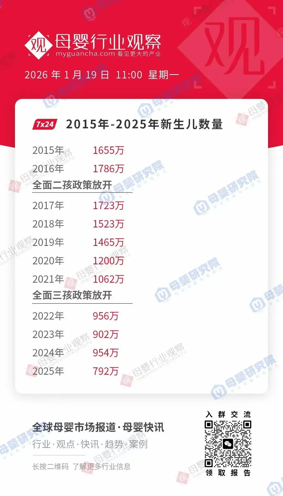 1月19日,国家统计局公布了最新人口数据,2025年全年出生人口792万人,人口出生率为5.63‰;死亡人口1131万人,人口死亡率为8.04‰;2025年年末全国人口为140489万人(包括31个省、自治区、直辖市和现役军人的人口,不包括居住在31个省、自治区、直辖市的港澳台居民和外籍人员),人口自然增长率为-2.41‰。这已经是连续第4年人口自然增长率为负。结合历年数据来看,2016年至2025年,全国每年的出生人口数据分别为1786万、1723万、1523万、1465万、1200万、1062万、956万、902万、954万、792万,2025年出生人口数量为近10年来最低,也是首次(1949年以来)下降至800万人以下。2016年至2025年,人口出生率分别为13.57‰、12.64‰、10.86‰、10.41‰、8.52‰、7.52‰、6.77‰、6.39‰、6.77‰、5.63‰,2025年人口出生率也为近年来最低。除出生人口数据外,国家统计局还同步公布了截至2025年末总人口的性别构成、年龄构成、城乡构成:男性人口71685万人,女性人口68804万人,总人口性别比为104.19(以女性为100);16—59岁人口85136万人;60岁及以上人口32338万人,占全国人口的23.0%,其中65岁及以上人口22365万人,占全国人口的15.9%,同比继续上升。0-15岁人口经推算为23015万人。城镇常住人口95380万人,乡村常住人口45109万人,城镇化率为67.89%,同比提高0.8%。结合国家统计局相关数据解读来看,整体上,一方面,中国人口规模巨大,仍超现有发达国家人口总和,生产与消费潜力巨大,另一方面,中国人口少子化和老龄化的挑战仍在,根据国务院发展研究中心发布的《中国发展报告2023》,未来中国人口出生率将延续较低水平。而这背后涉及结婚年龄延后(《中国人口普查年鉴》调查显示,2022年平均初婚年龄为28.67岁,这一数据较2010年增加了3.78岁)、年轻人生育意愿下降、育龄妇女减少(根据第七次全国人口普查数据,90后和00后的存活人口数量分别为1.78亿和1.55亿)、不孕不育比例偏高四重因素。不过,虽然2025年出生人口数量和出生率再创新低,但2026年新生儿数量还是有止跌回升的可能。结婚人数(尤其是初婚人数)变化与出生人口数量变化呈正向相关,例如据民政部数据,2015年至2024年全国结婚登记数为1224.7万对、1142.8万对、1063.1万对、1013.9万对、927.3万对、814.3万对、764.3万对、683.5万对、768.2万对、610.6万对。根据目前的民政部最新数据,2025年前三季度结婚登记数为515.2万对,同比增长40.5万对,照此趋势,如无意外,2025年结婚登记数将超过2024年结婚登记数。近年来,国家加大鼓励生育支持力度,多方面出击构建生育友好型社会。在部分地区,已有成效显现,例如近日,据《天门日报》消息,湖北天门宣布2025年全市出生人口数量实现正增长,而2024年天门市出生人口数量为7217人,2017年来首次由降转增。另据《中国人口报》消息,天门市相关部门负责人曾透露,经测算,在鼓励生育方面,2024年至2026年,天门市预计投入将超3亿元。2025年和2026年国家更是亮出系列组合拳,各省市则积极跟进部署落地。首先是育儿补贴,2025年7月,《育儿补贴制度实施方案》发布,9月起正式开发申领,截至2025年12月31日,全国31个省(自治区、直辖市)均已发放,发放人数超过2400万人,2025年度育儿补贴发放率达80%左右。近日,2026年度育儿补贴申领也已开启。其次是各类婚育、生育、托育、教育支持政策,如2025年5月,新修订的《婚姻登记条例》正式实施,婚姻登记全国通办成为现实;7月,国务院办公厅印发《关于逐步推行免费学前教育的意见》,降低育儿家庭教育成本;10月,十五五规划发布,提出优化生育支持政策和激励措施,有效降低家庭生育养育教育成本等多项最新部署;12月,中央经济工作会议强调,要倡导积极婚育观,努力稳定新出生人口规模;同月,托育服务法草案提请人大首次审议,加大托育服务支持力度。从短期来看,2025年出生人口数量减少必然对母婴行业带来一定影响,一是减量竞争加剧,一方面头部集中,另一方面加速清出,对玩家的综合实力,尤其是把脉当代消费者需求偏好痛点的能力有更高的要求;二是拓人群尤其是中大童以及青少年人群以及布局银发经济,或成为越来越多品牌的必然选择,一则这两类人群规模还在增长,二则从消费决策到品类相似度,由母婴到全家壁垒不深,例如乳制品和纸尿裤。从长期来看,每年的出生人口数量规模或趋于低增长稳定状态,而母婴品类属于刚需,且新生代父母舍得为宝宝健康成长、科学养育、多维发展进行投资,而随着中国品牌的崛起,海外天地同样大有可为。展望2026年,虽母婴行业仍将承压,但相信已经过多年洗礼的各母婴玩家,仍有望通过或创新、或拓展、或细分的路径交出精彩答卷。