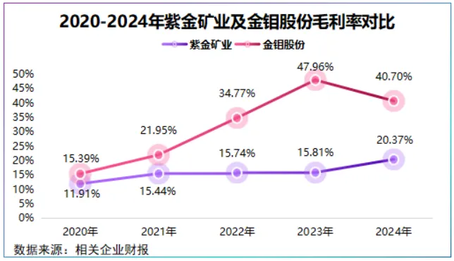 2020-2024年,紫金矿业毛利率均值为16.56%,金钼股份领先其约16个百分点,为32.15%。