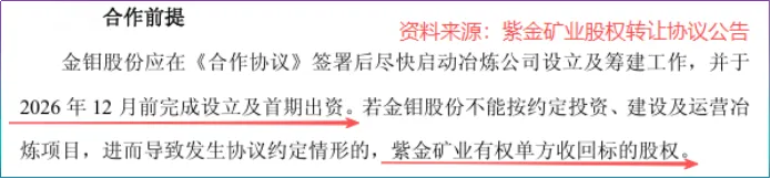值得注意的是,为确保项目顺利投产,紫金矿业设立了股权回购触发机制,即金钼股份必须在2026年12月前完成设立及首期出资。
