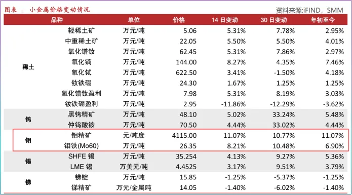 目前看,钼价格已经出现上涨迹象,过去两周,钼精矿价格达4115元/吨度,上涨11.07%,钼铁(Mo60)价格达26.35 万元/吨,上涨8.21%。
