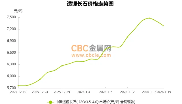 今日中国透锂长石(Li2O:3.5~4.0)市场含税现款报价下跌,目前在6570~7990元/吨,均价7280元/吨,较昨日下跌120元/吨。