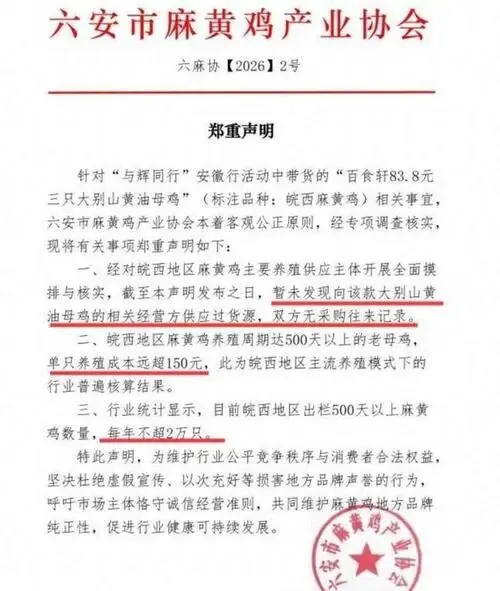 2026年1月9日,“六安市麻黄鸡产业协会”突然亮剑,声明三连击——货源无证、价格离谱、产量不符,直指直播间商品涉嫌虚假宣传。