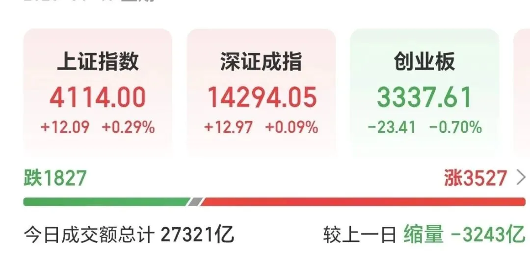 上证指数涨0.29%,深成指涨0.09%,创业板指跌0.70%。沪深两市上涨股票3527只,下跌股票1827只。今日三市成交金额总计2.73万亿,较上一日缩量3243亿元。量能连续15天站上2万亿了。大盘资金净流出了533.51亿。