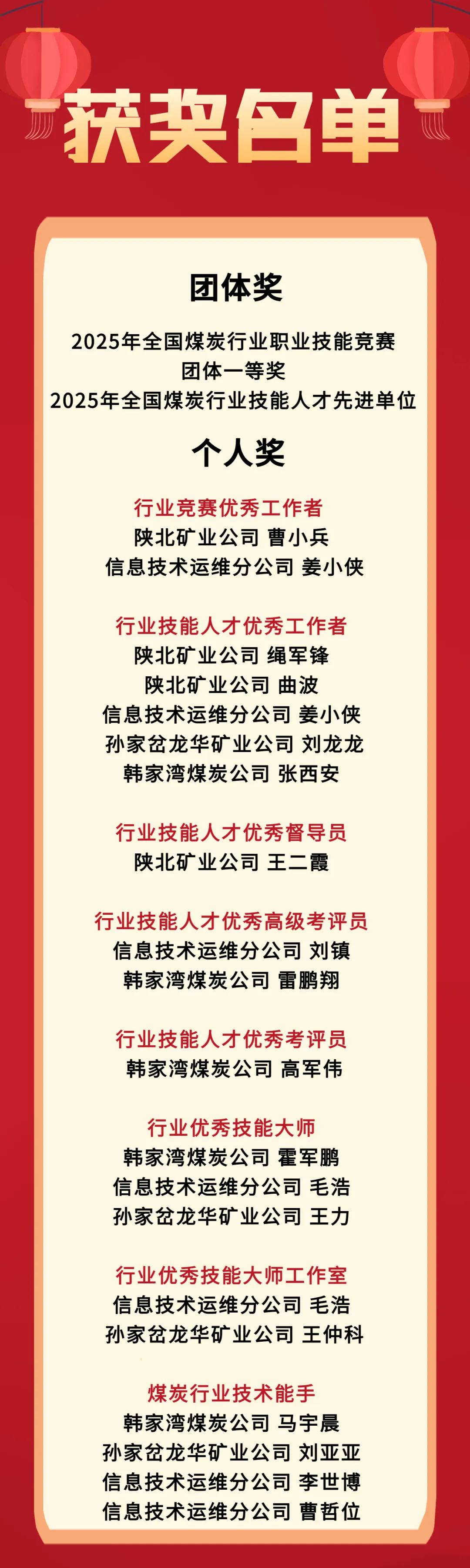 近日,在2025年度全国煤炭行业技能人才工作总结会暨职业技能竞赛总结会上,陕北矿业公司载誉而归,一举夺得“2025年全国煤炭行业职业技能竞赛团体一等奖”和“2025年全国煤炭行业技能人才先进单位”两项集体荣誉;并有2名行业技能竞赛优秀工作者、5名行业技能人才优秀工作者、1名督导员、2名高级考评员、1名考评员、3名技能大师,2个大师工作室获得表彰。同时,还有4名在2025年度全国煤炭行业技能竞赛中获得一等奖的职工被授予“煤炭行业技术能手”称号。