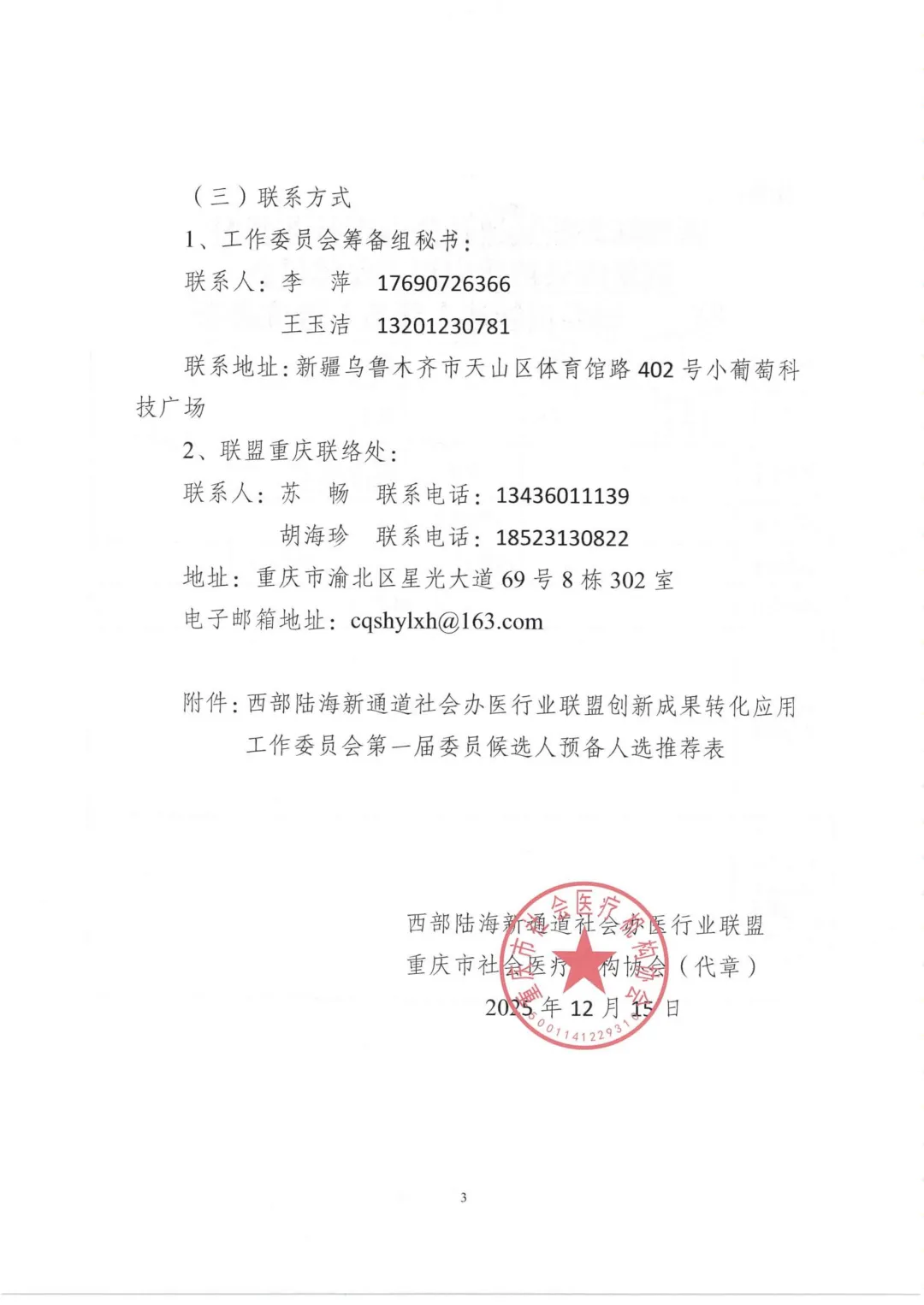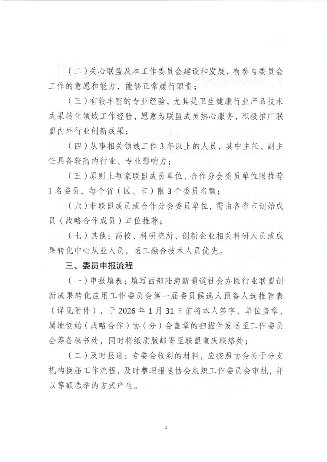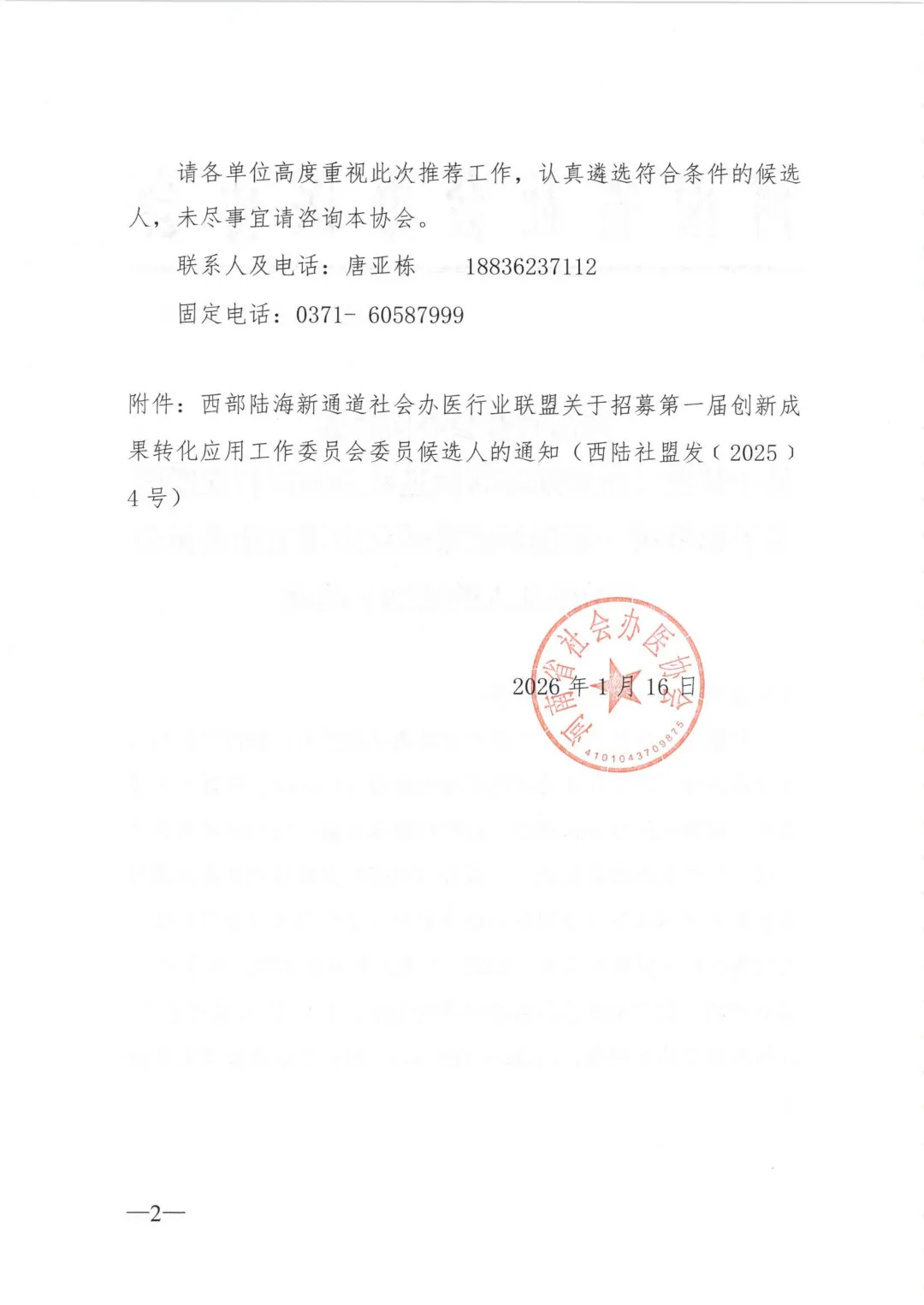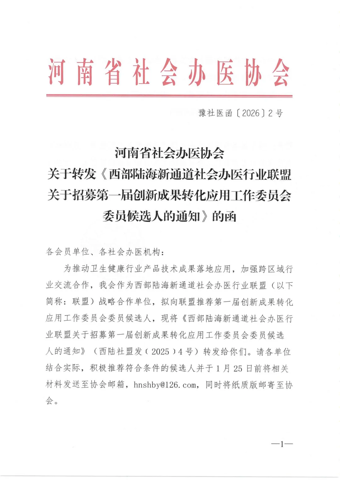 转发《西部陆海新通道社会办医行业联盟关于招募第一届创新成果转化应用工作委员会委员候选人的通知》的函