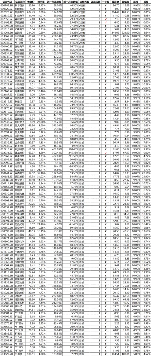 ◆今天涨停股中有招金黄金(000506.SZ)、万泽股份(000534.SZ)、胜通能源(001331.SZ)、思源电气、海南发展(002163.SZ)、九鼎新材(002201.SZ)、利尔化学(002258.SZ)、华明装备(002270.SZ)、新联电子(002546.SZ)、巨人网络(002558.SZ)、金安国纪(002636.SZ)、友邦吊顶(002718.SZ)、锋龙股份、嘉美包装(002969.SZ)、双杰电气、延江股份、特变电工(600089.SH)、东睦股份(600114.SH)、国电南自(600268.SH)、标准股份(600302.SH)、广东明珠(600382.SH)、航发科技(600391.SH)、保变电气(600550.SH)、天目药业(600671.SH)、四方股份(601126.SH)、中国西电(601179.SH)、金海通、海星股份(603115.SH)、华正新材(603186.SH)、日盈电子(603286.SH)、五洲新春、铁流股份(603926.SH)、法狮龙(605318.SH)、博迁新材(605376.SH)、福莱新材(605488.SH)、欧科亿、ST八菱(002592.SZ)、ST嘉澳(603822.SH)等38只个股近一年涨幅高于100%,较上周五增加8只,含2只ST个股;