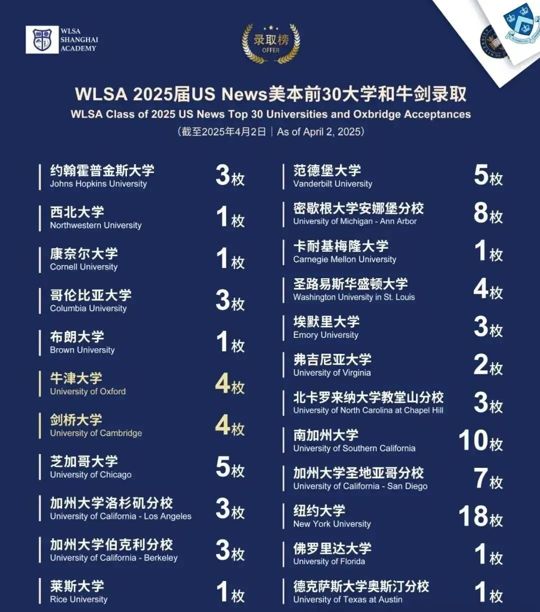 截止到2025月4月2日,WLSA上海学校2025届202名毕业生(其中美高项目132名,A-Level项目70名)已获得近800份顶尖大学录取通知书,覆盖美国、英国、加拿大、澳大利亚、中国香港等国家和地区,其中美国方向申请占比70.3%,英国方向43.1%,多国多地区联申比例显著提升至近55%,彰显了学生多元化升学路径和国际化的视野。