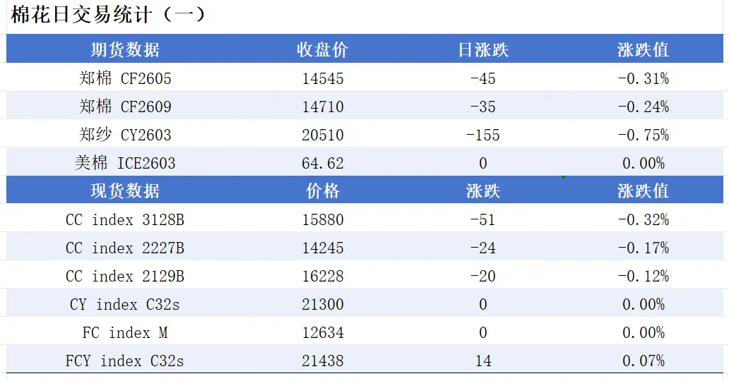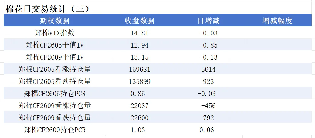 主力合约CF2605收于14545元/吨,跌幅0.31%;远月CF2609收于14710元/吨,跌幅0.24%。期货价格弱势调整,整体呈现近弱远强格局但。1、供应端:国内新棉上市供应充足,下游纺织企业采购谨慎,现货价格承压。2、需求端:下游棉纱市场表现一般,纺企利润被压缩,补库心态谨慎。但春节前备货预期仍存一定支撑。3、外盘方面:1月16日,美棉主力合约窄幅下跌,USDA月报调减全球产量、调增消费,对棉价形成一定支撑,但宏观氛围及节前仓位调整压制涨幅,美棉短期维持低位震荡。内外棉价差处于高位,若持续走扩可能刺激进口棉补充,限制郑棉上行空间。1、价格形态:1月19日郑棉期货呈现窄幅下跌、合约分化态势。主力CF2605合约收盘跌幅0.31%,成交缩量6.35万手,持仓减少2.16万手,量仓双缩反映市场节前观望情绪浓厚,主动交投意愿不足。远月CF2609合约表现相对抗跌,跌幅0.24%,成交放量0.94万手,持仓增量0.26万手,量仓齐增显示部分资金开始布局远月合约,博弈中长期供需变化。2、相对强弱RSI指标:CF2605与CF2609合约7日RSI分别为44.79、44.50,均处于50中性线下方,短期偏弱但未进入超卖区间;14日RSI分别为55.72、55.96,维持在中性偏强区间,表明中期趋势尚未完全走弱。结合关键支撑压力位分析,CF2605合约当前价格接近14500元/吨核心支撑位,上方14800-14900元/吨形成核心阻力,短期大概率维持区间震荡。1、持仓结构:(1)CF2605多空均减仓,空头减仓幅度更大(空-17689手vs多-11684手),多空比维持在0.80,空头仍占优势但边际减弱。(2)CF2609多空均增仓,多头增仓更积极(多+1910手vs空+1551手),多空比0.67,多头增仓略占优势,反映市场对远月供给收缩预期存在博弈。2、资金流向:主力合约CF2605流出资金2.46亿元,流出可能源于短期调整预期;远月CF2609流入2385万元,小幅增仓表明部分资金布局中长期。1、波动率:郑棉VIX收于14.81%,处于偏低水平;CF2605平值隐含波动率12.94%,历史波动率9.09%,隐含波动率高于历史波动率,反映期权市场对潜在波动的预期。2、市场情绪:CF2605持仓PCR为0.85,(偏多情绪),CF2609为0.99(接近均衡),显示近月期权市场情绪略偏多,远月中性。1、1月20日价格走势预计延续震荡偏弱走势,主力CF2605支撑位参考14400-14450,压力位14600-14650;CF2609支撑位14600附近,压力位14800。(2)技术面:RSI短期偏弱,但未进入超卖区间,下跌空间有限(4)期权信号:隐含波动率偏低,反映市场未预期大幅波动,短期或延续窄幅整理。(1)短线交易:在14450-14650区间高抛低吸,止损各设100点。(2)趋势交易:暂观望,等待价格突破14650或跌破14450后顺势跟进。(3)套利关注:CF5-9价差目前-165,若价差收窄至-150以内可考虑反套(空CF2605多CF2609)。(1)波动率交易:隐含波动率处于低位,可考虑买入宽跨式组合即CF2605-C-14600+CF2605-P-14400(同时买入虚值看涨和看跌期权),博弈价格突破。(2)方向性交易:若看好区间震荡,可卖出CF2605-C-14600+CF2605-P-14200的宽跨式期权组合。总结:1月19日郑棉市场呈现缩量整理格局,资金向远月迁移但力度有限。技术指标显示短期偏弱,但中期趋势尚未破坏。预计1月20日延续震荡,建议区间操作或等待突破信号。以上观点仅供参考,并不作为市场交易依据,据此操作,风险自担!