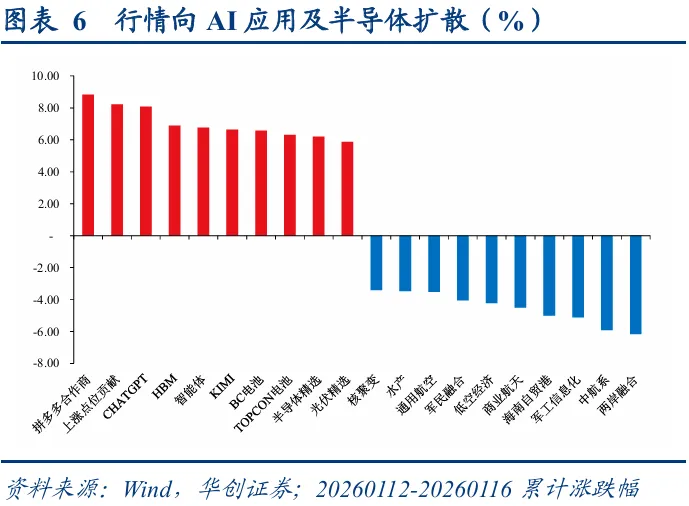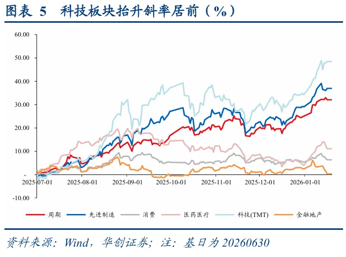 板块差异扩大,行情已有扩散。拆分结构来看,年初科技主线受益于商业航天等热点轮番催化,板块跃升斜率居前,为本轮行情贡献主要增量,如果以估值历史分位作为参考,主线行情或已进入“高热区”。相对应的隐忧则是,虽然当下权益市场成交积极性仍强,但随着主题行情逐步向AI应用及半导体等泛科技方向分化,存在资金抱团力度削弱导致动能衰减,以及资金分化导致行情扩散的可能性,这一点在转债市场同样存在一定线索——科技板块平价自1月14日之后出现小幅回调。