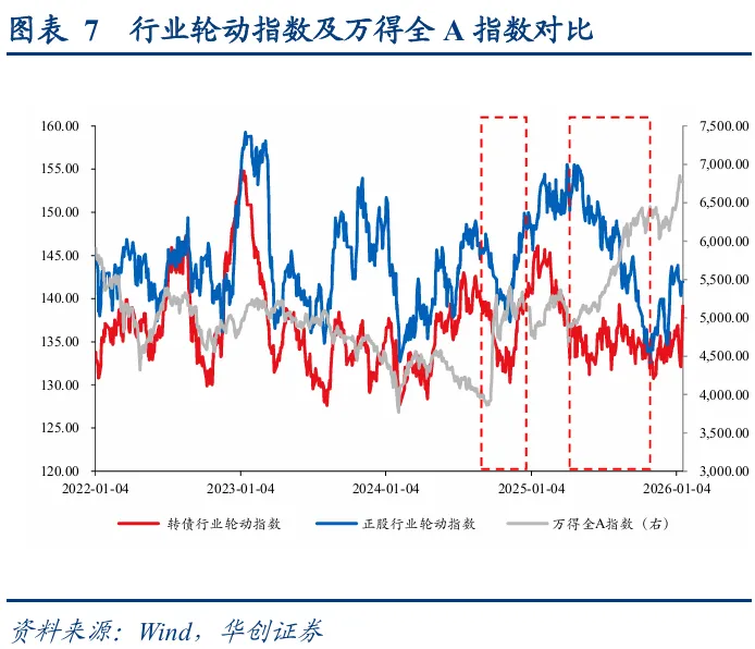 热点行情下主题明确,后续行情或有扩散。历史上权益市场的放量上涨行情多数对应着行业轮动指数的同步回落,资金在主题行情下通常存在显著抱团,而后在各类扰动下行情阶段性放缓或走弱,此时抱团资金逐步向外扩散以寻求新的落脚点,一方面是权益市场动能转弱,另一方面资金外溢推动行业轮动加速。