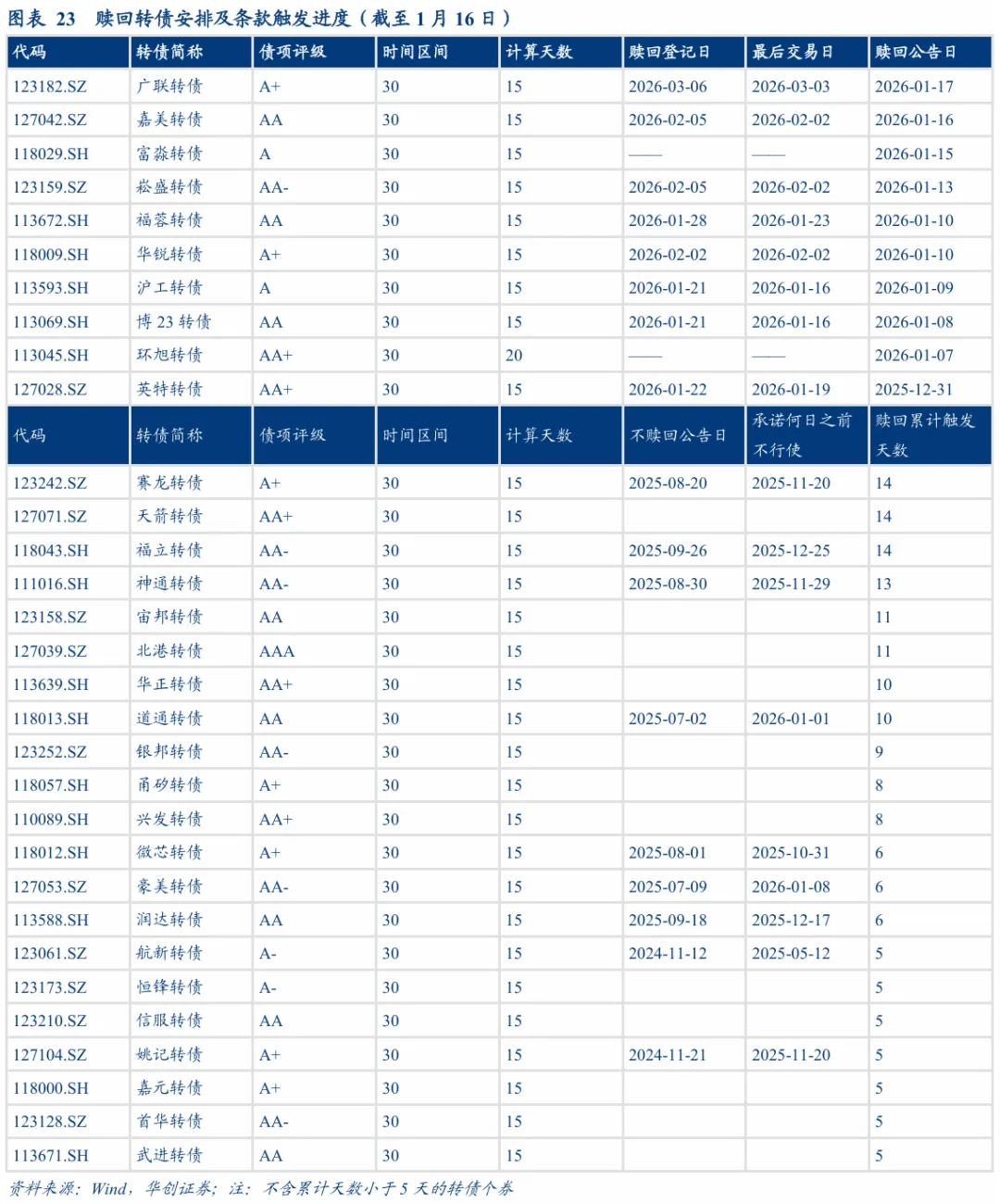 截至1月16日,广联、富淼、嘉美、崧盛转债公告提前赎回;精测转2、电化、欧通、精达、泰福转债公告不提前赎回;福立、赛龙、北港、神通、宙邦、华正、道通转债公告预计满足强赎条件。