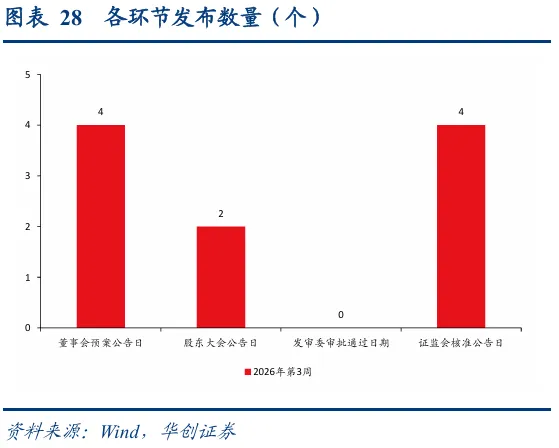 上周4家新增董事会预案、2家新增股东大会通过、无新增发审委审批通过、4家新增证监会核准,较去年同期分别+4、+2、+0、+3。