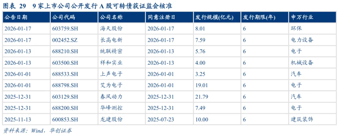 截至1月16日,共有9家上市公司拿到转债发行批文,拟发行规模86.90亿元。通过发审委的共有1家上市公司,规模3.75亿元。上周金道科技、中创智领、彩讯股份、鼎通科技新增董事会预案,规模合计70.46亿元。