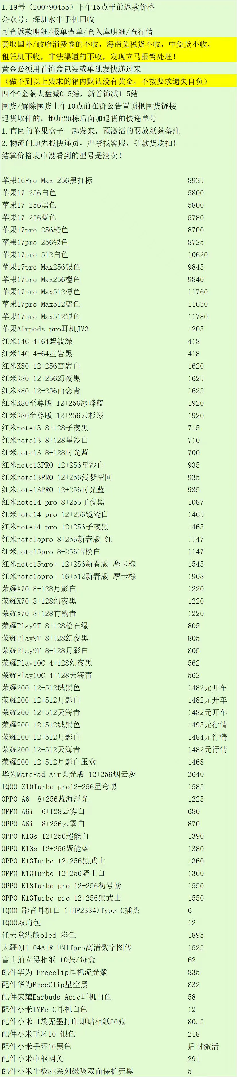返款价格上面没有的型号颜色也收,当天有到的才有出结算价格。