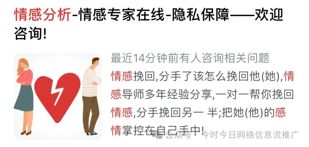 • 在广告中提供一些实用的情感建议,如如何处理恋爱中的矛盾、如何提升婚姻质量等。这些建议不仅可以吸引用户的关注,还能展示你的专业水平,增加用户对你的信任。